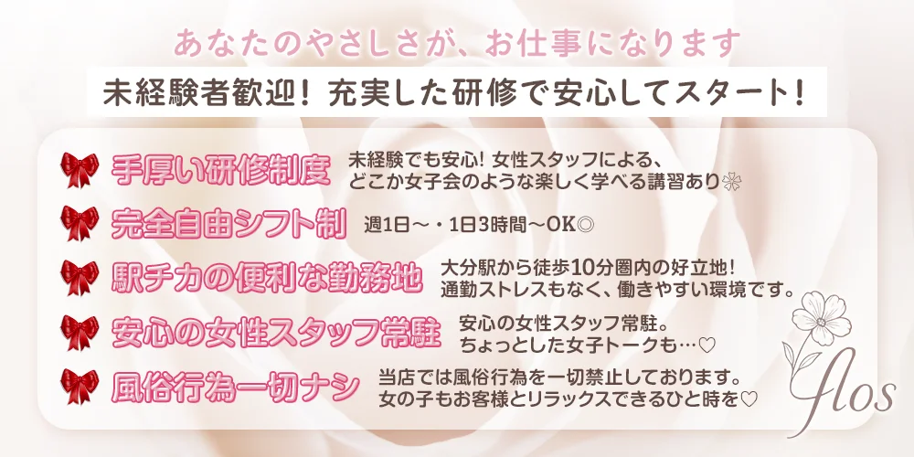 - 「できるかな…」って思う気持ちがあっても大丈夫𓂃𓈒𓏸 flosでは、スタッフみんなであなたをしっかり支えていきます💌 女性スタッフも常にいるから、 ちょっとした不安や小さな疑問でも、気軽にお話ししてくださいね🕊️ 未経験の方も安心して始められるように、 女性講師と女性スタッフが丁寧に講習を行います🌸 大切なのは“ありのままのあなた”でいること。 flosで、あなたらしい一歩を一緒に踏み出しましょう🌷 複数人の女性スタッフがいるため、みんな仲良く和気あいあいにお仕事を楽しんでます😌